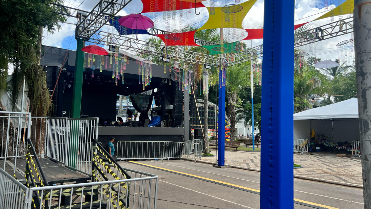 As faixas, guarda-chuvas e enfeites em diversas cores já preenchem o espaço, colorindo a principal praça da cidade.