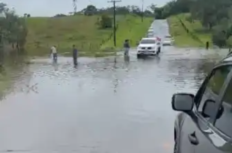 Um córrego às margens da rodovia transbordou e alagou a via, fazendo com que alguns veículos tivessem dificuldade de fazer a travessia no local. Em um vídeo que circula na internet, um condutor orienta outros motoristas a não passar pela região.