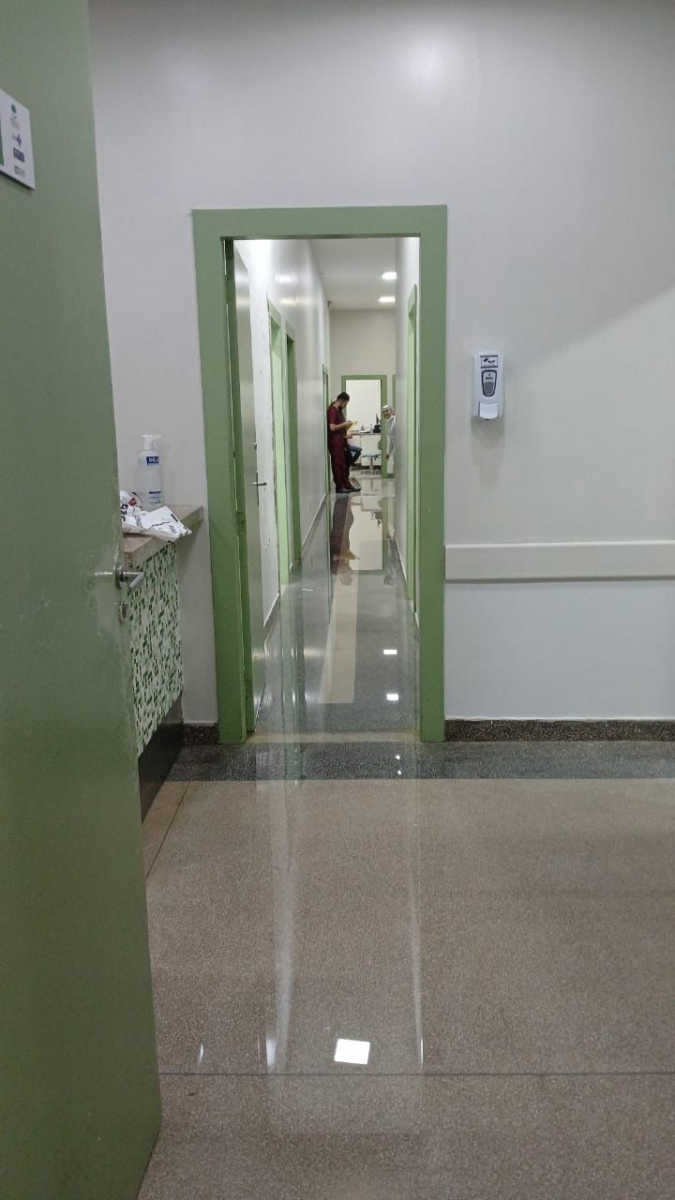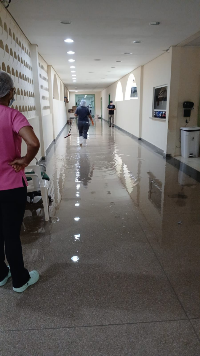 Além disso, a água da chuva não atingiu somente os corredores externos da unidade, afetando também espaços mais internos do local, causando maior preocupação para os funcionários, que tentavam eliminar o líquido.