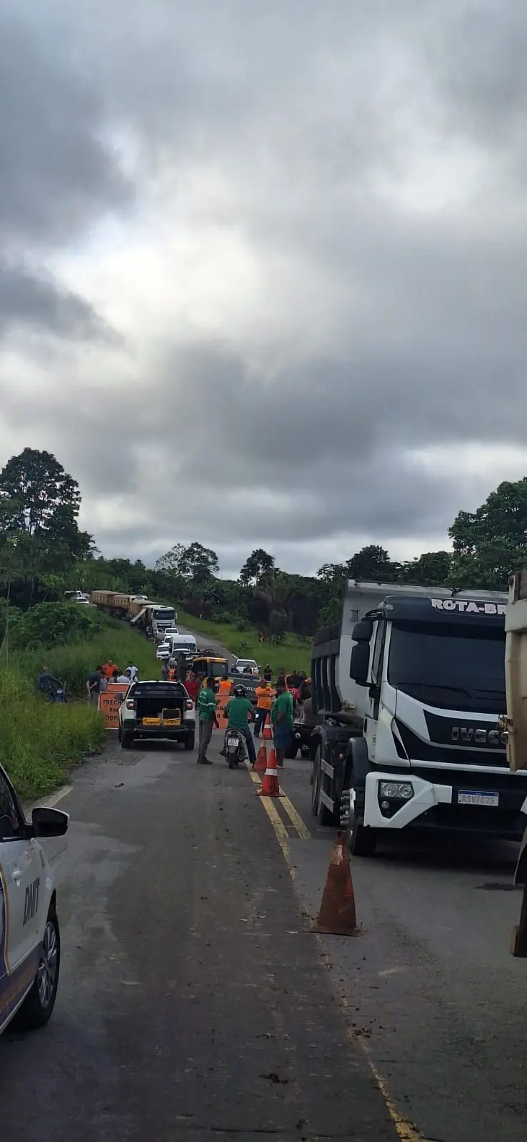 Imagens feitas pelo radialista Raimundo Accioly mostram uma fila gigantesca de carretas, caminhões e outros veículos que trafegavam com destino ao vale do Juruá. Os reparos que estão sendo feitos visam a implantação de tubulação e pedras onde a estrada se abriu para que o tráfego volte a normalidade. A expectativa é de que isso possa acontecer no inídio da tarde desta segunda-feira (24).