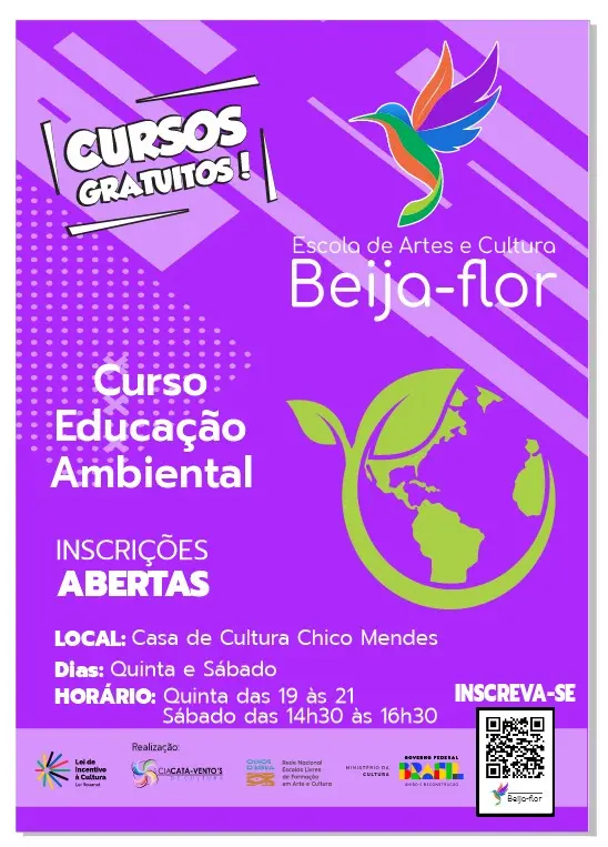 A Escola de Artes e Cultura Beija-flor está com inscrições abertas para o curso gratuito de Educação Ambiental, que acontecerá na Casa de Cultura Chico Mendes, bairro Chico Mendes, região do São Francisco, em Rio Branco (AC). As aulas serão realizadas às quintas-feiras, das 19h às 21h, e aos sábados, das 14h30 às 16h30.