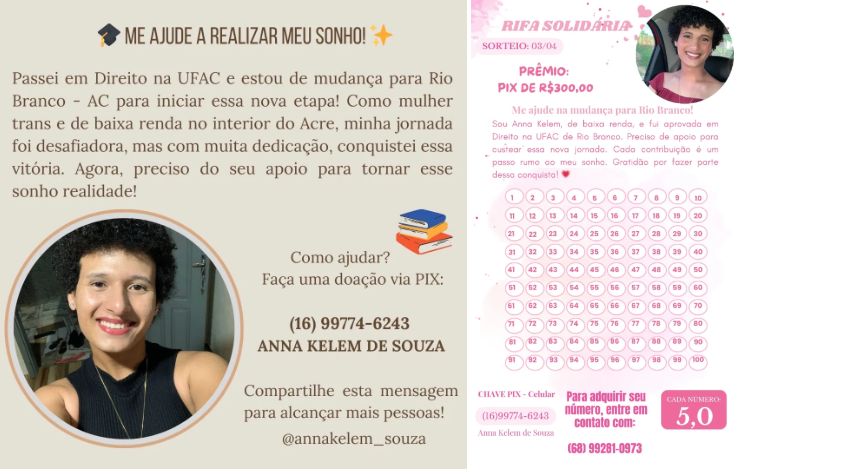 A estudante Anna Kelem de Souza, mulher trans de 18 anos, moradora do município de Cruzeiro do Sul, está realizando uma vaquinha e uma rifa online para conseguir se mudar para a capital, onde irá cursar Direito, na Universidade Federal do Acre (Ufac).