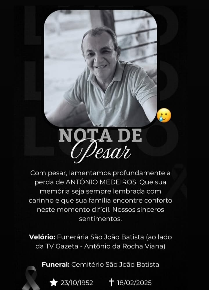 O sepultamento ocorrerá no Cemitério São João Batista, onde Antônio Medeiros será eternizado no descanso eterno. Aos familiares e entes queridos, manifestamos nossos mais sinceros sentimentos neste momento de dor e despedida.