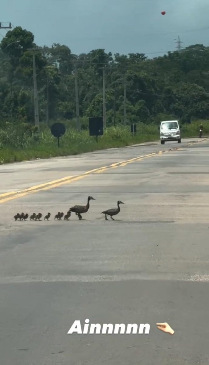 No vídeo compartilhado, é possível ver um casal de aves atravessando a rodovia Via Verde, uma das mais movimentadas de Rio Branco, com cerca de 11 filhotes. Os pequenos seguem o suposto casal de pais, que guiam o caminho para atravessarem a estrada criando um momento descontraído.