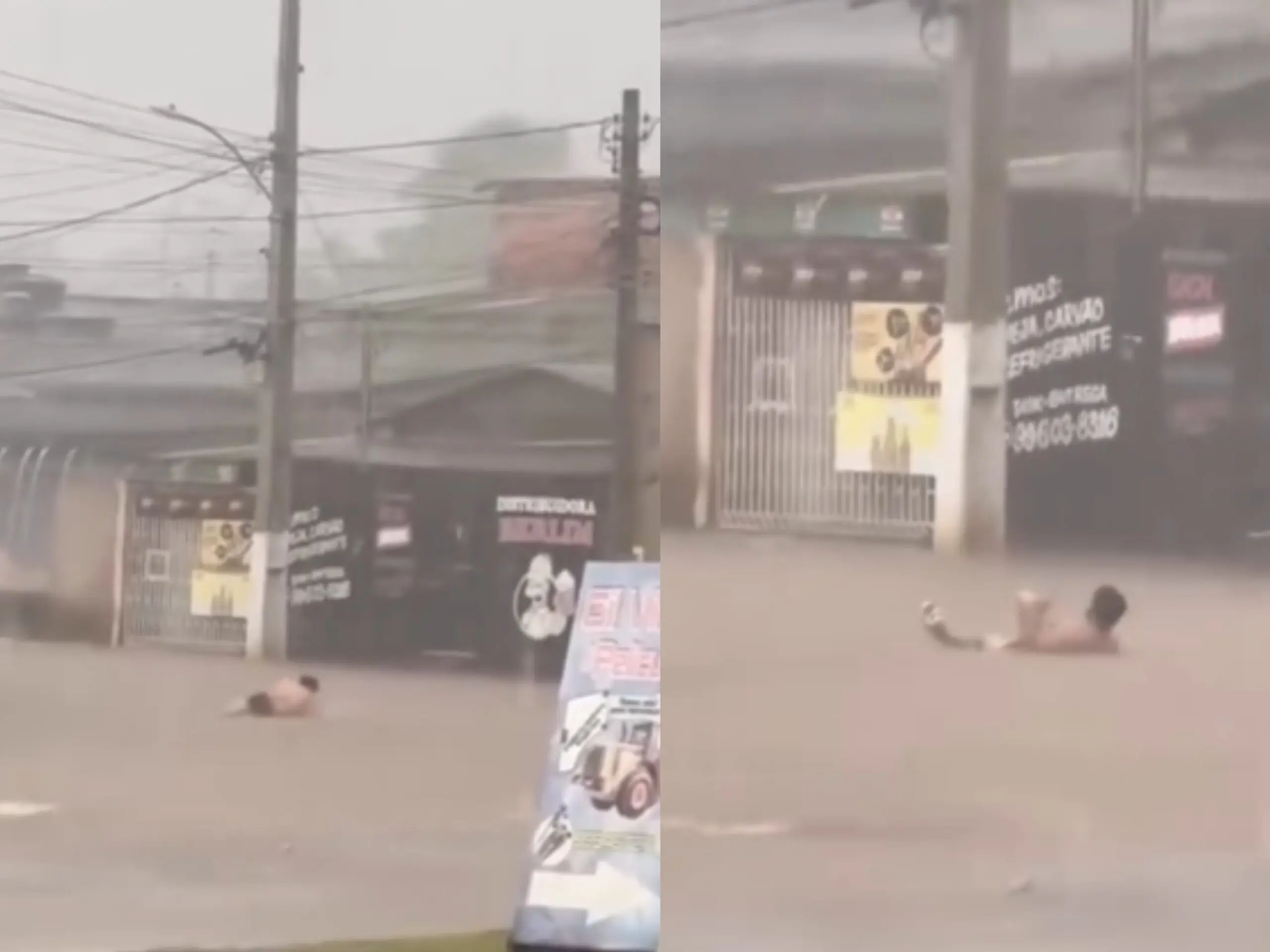 Um vídeo publicado pela página Click Ac mostra um homem entrando na poça de água que ficou na avenida e tomando banho só de cueca.