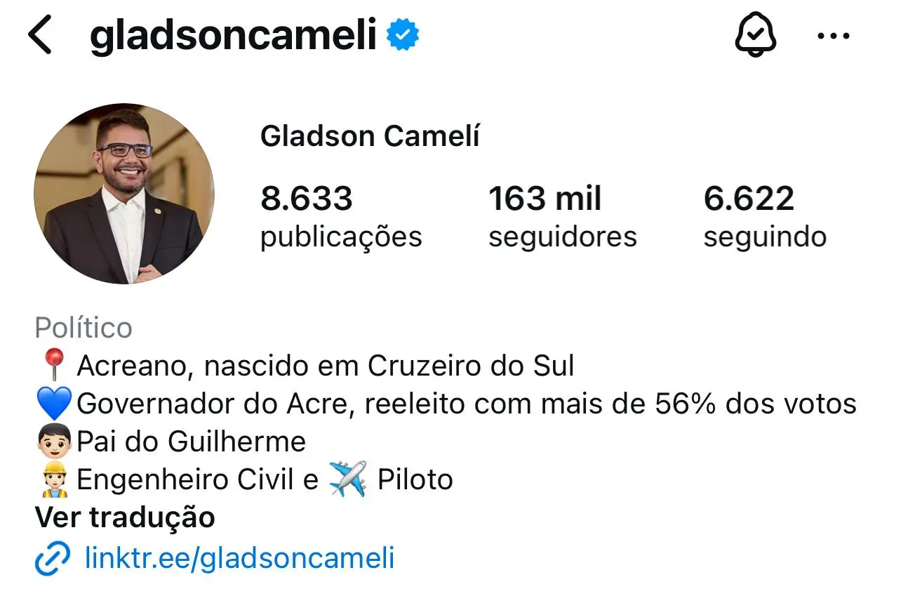 O governador Gladson Cameli modificou a grafia de seu nome em seu perfil no Instagram, alterando a antiga para Camelí, com acento agudo na última letra.