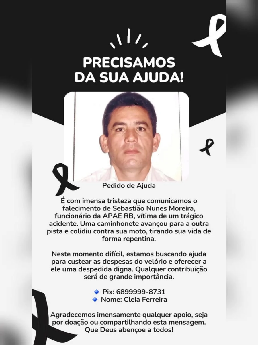 Familiares iniciaram uma campanha de arrecadação para cobrir os custos do velório e garantir uma despedida digna para o antigo funcionário da Apae. “A contribuição pode ser feita via Pix para Cleia Ferreira”, informaram em um comunicado divulgado junto a uma imagem com os dados bancários.
