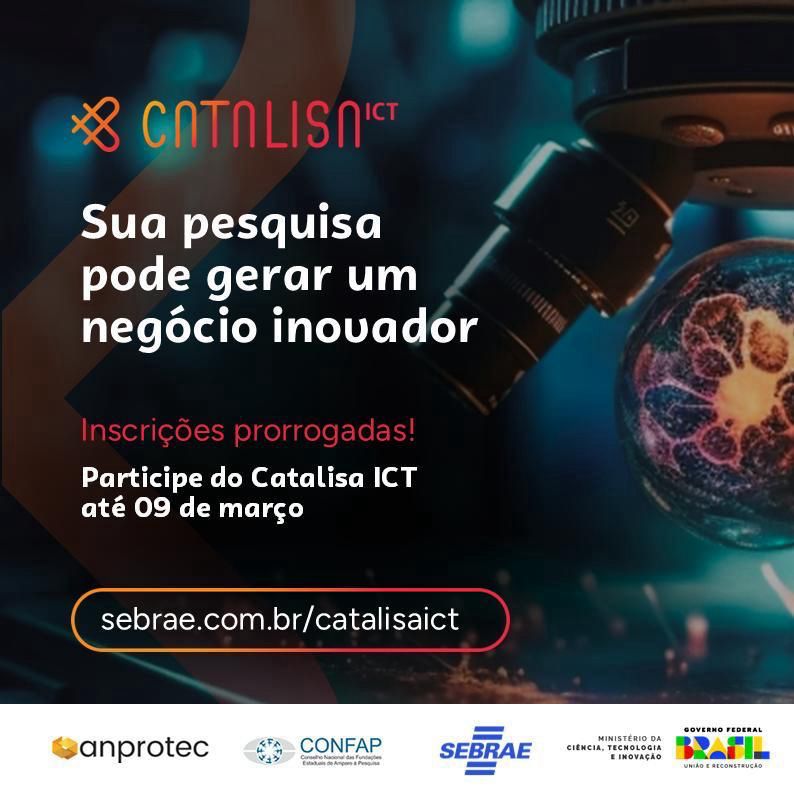 Foi prorrogado para o dia 9 de março o prazo de inscrições para o novo ciclo da jornada Catalisa ICT, programa do Sebrae que tem como objetivo transformar pesquisas com potencial de inovação em soluções de impacto para a sociedade. O edital é voltado para mestres e doutores, com pesquisas concluídas ou em andamento, e que participem desde o primeiro ciclo do programa.