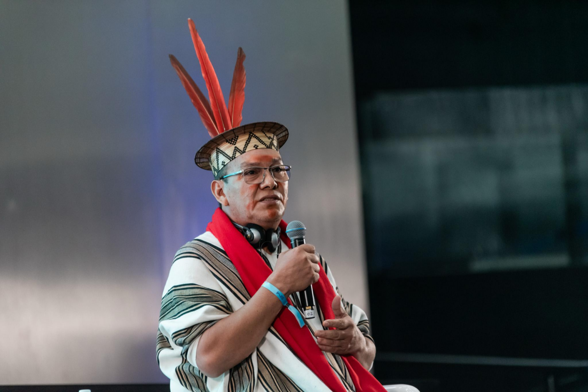 O líder do povo Ashaninka participou de evento ao lado de cientista climática e guitarrista do Radiohead/Foto: Cedida
