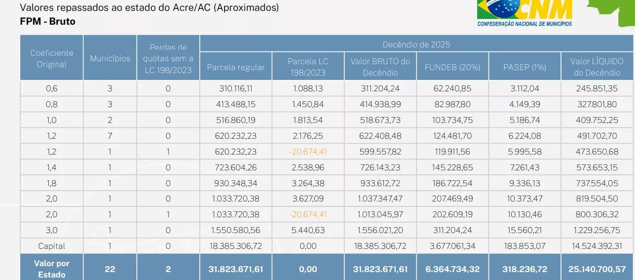 A terceira parcela do Fundo de Participação dos Municípios (FPM), de fevereiro, será creditado nas contas das 22 prefeituras acreanas nesta sexta-feira (28). O total creditado será de R$31.823.671,61.