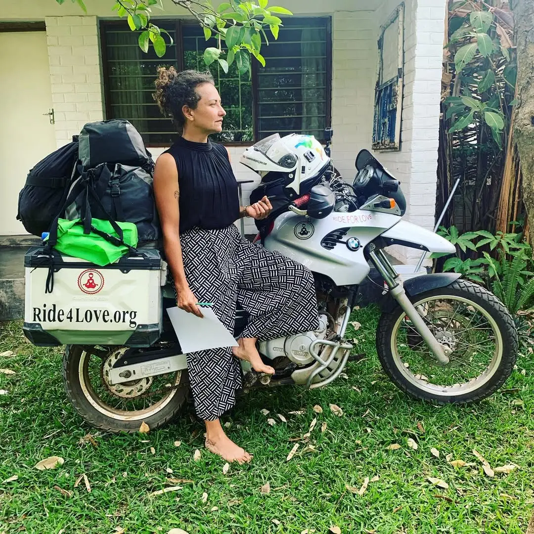Francesa que viaja o mundo de moto ao lado da gata chega ao Acre para dar aula de Yoga