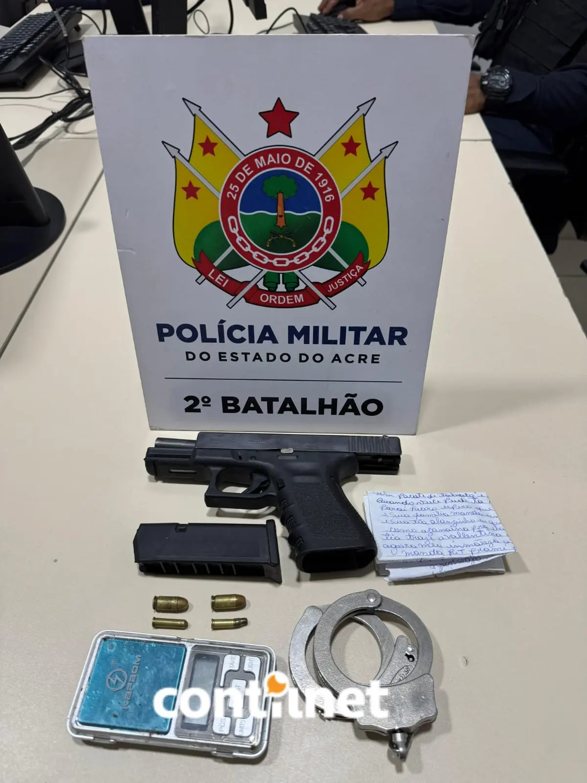 Arma de fogo, munições e balança de precisão apreendidas durante a prisão dos criminosos/Foto: ContilNet