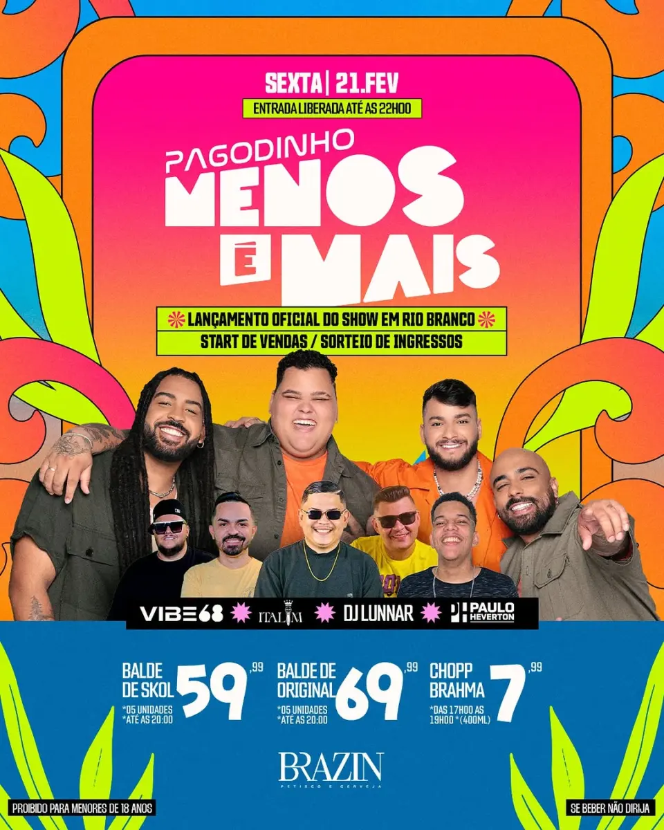 Rock não é pra você? Então bora de pagode lá no Brazin, que traz um esquenta pro Menos é Mais, incluindo a abertura das vendas de ingressos, que poderão ser adquiridos no local!