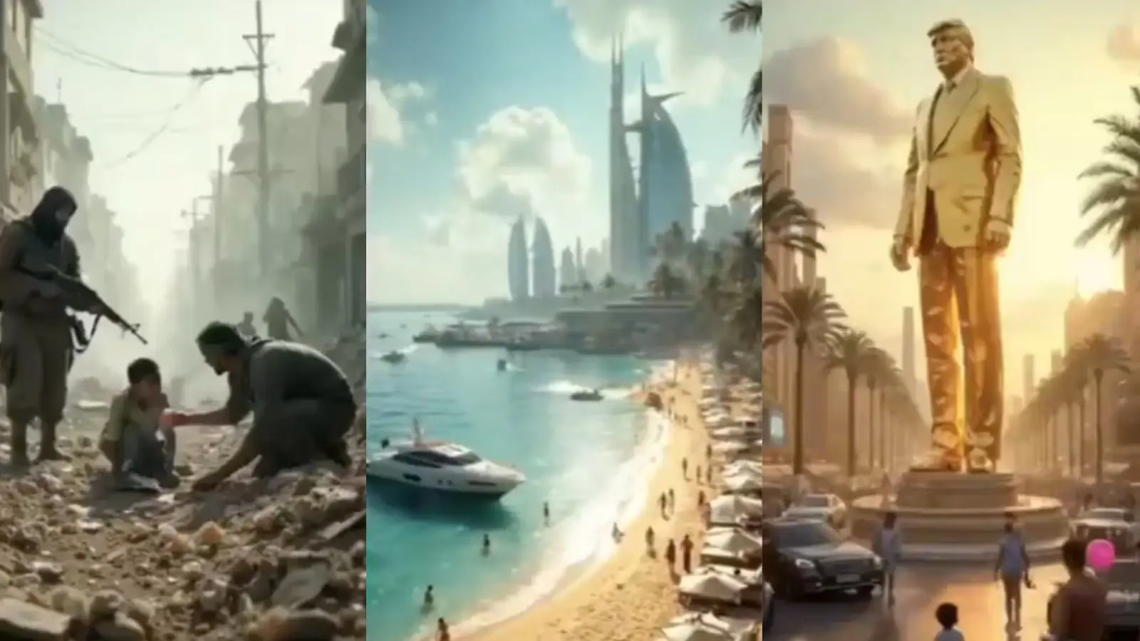 Com a legenda “Gaza 2025”, a montagem exibe também uma estátua gigante de Trump em ouro no meio de uma rua, o premiê israelense Benjamin Netanyahu tomando drinque em uma piscina e Elon Musk distribuindo dólares a crianças em uma praia.