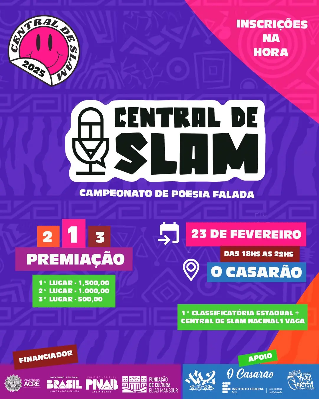 Para encerrar a programação, os participantes terão a oportunidade de se apresentar no campeonato estadual de poesia falada (slam), que será realizado no dia 23 de fevereiro, no O Casarão. O evento é aberto ao público e pretende dar visibilidade ao talento dos jovens poetas, proporcionando um espaço de troca e valorização da arte periférica.