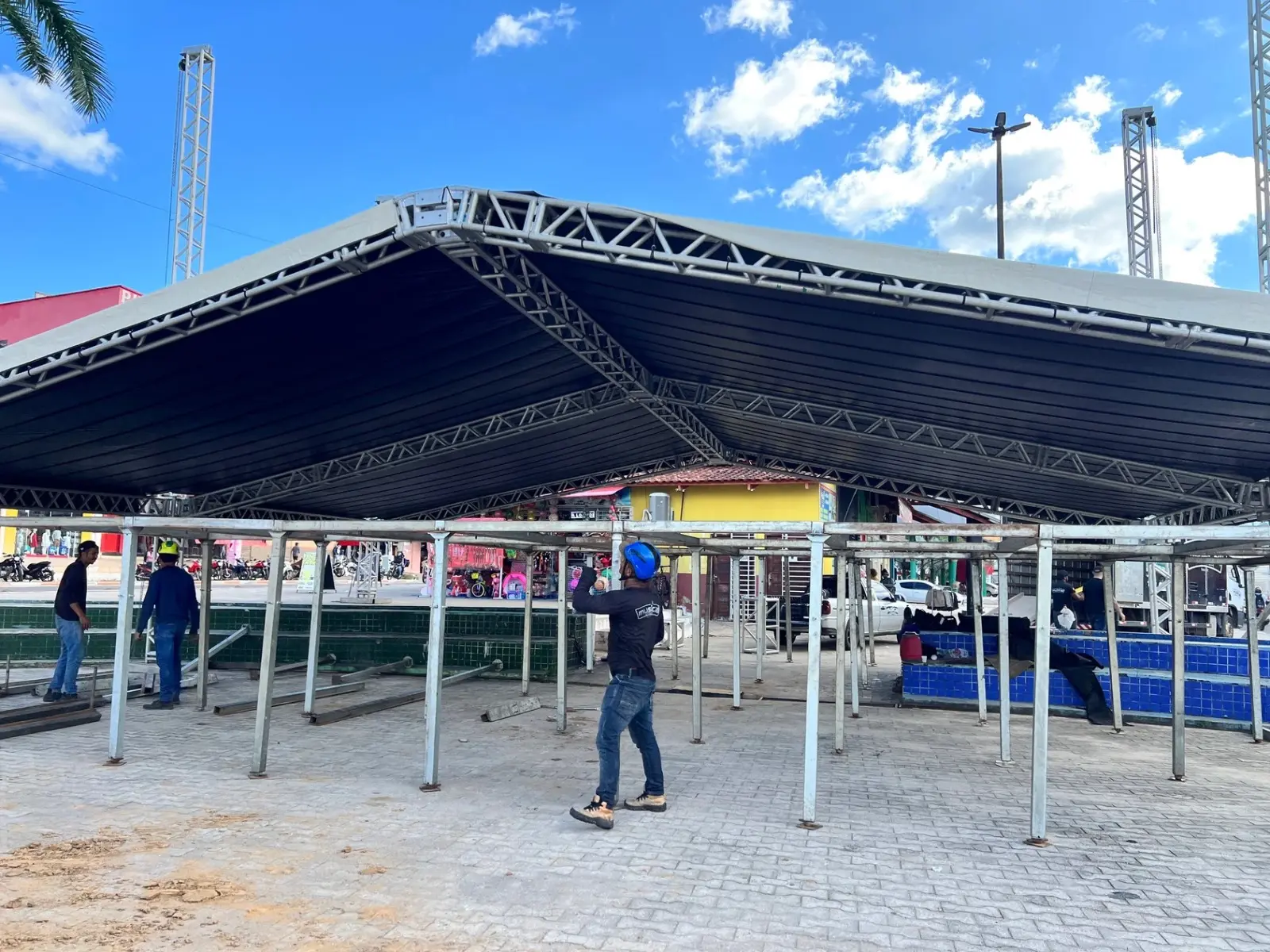 O palco do Carnaval Cultural Magid Almeida, em Cruzeiro do Sul está sendo montado na Praça Orleir Cameli. Foto: Reprodução