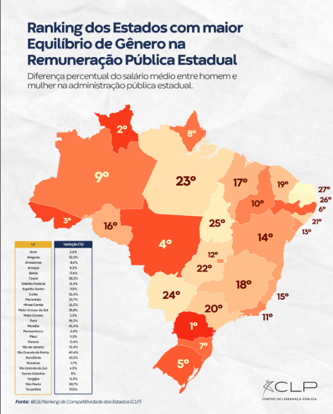 O Ranking de Competitividade dos Estados incluiu o indicador “Equilíbrio de Gênero na Remuneração Pública Estadual”, com o objetivo de avaliar a diferença percentual entre o salário médio de homens e mulheres na administração pública estadual, destacando os estados que apresentam maior equilíbrio.