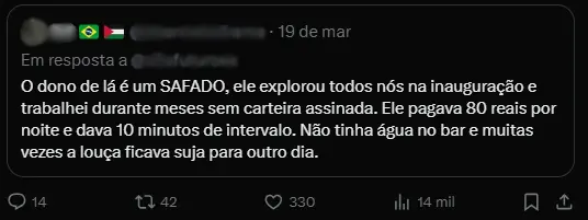 “O dono de lá […] explorou todos nós na inauguração, e trabalhei durante meses sem carteira assinada. Ele pagava R$ 80 reais por noite e dava 10 minutos de intervalo. Não tinha água no bar e, muitas vezes, a louça ficava suja para o outro dia”, disse um internauta no X.