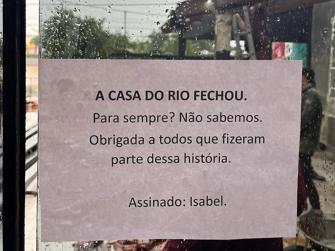 “A Casa do Rio fechou. Para sempre? Não sabemos. Obrigada a todos que fizeram parte dessa história. Assinado: Isabel.” diz o comunicado. O local era conhecido por sua gastronomia regional e funcionava de quarta a quinta a partir das 16h e de sexta a domingo a partir das 12h.