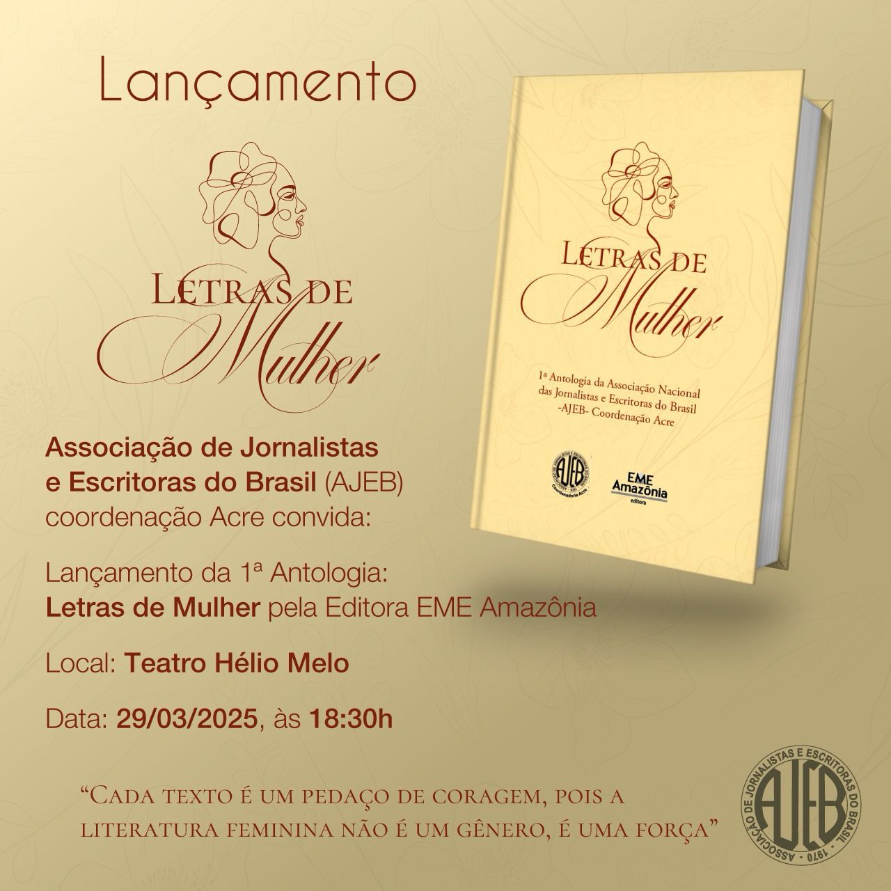 A Associação de Jornalistas e Escritoras do Brasil (AJEB), Coordenação Acre, convida o público para o lançamento da 1ª Antologia “Letras de Mulher”, uma obra que reúne textos de autoras comprometidas com a valorização da literatura feminina. O evento acontecerá no dia 29 de março de 2025, às 18h30, no Teatro Hélio Melo, em Rio Branco.