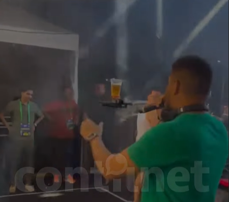 DJ Lauro Felix recebe sua cerveja Altaneira de um drone durante o Carnaval 2025, criando um momento único para o público na Praça da Revolução/Foto: ContilNet