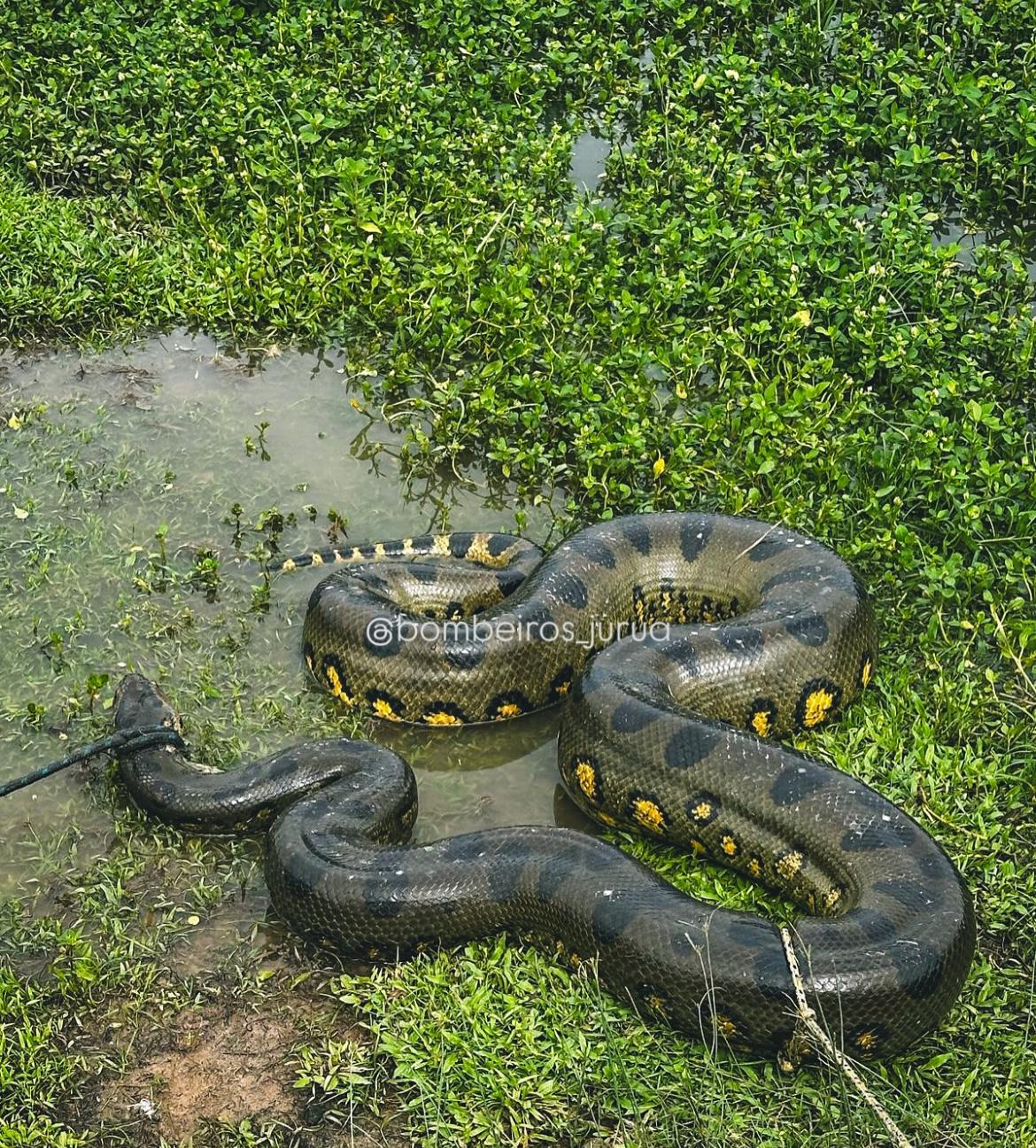 Militares do 4° Batalhão de Bombeiros Militar capturaram uma sucuri-verde (Eunectes murinus) em uma área urbana de Cruzeiro do Sul. O animal foi flagrado por um morador logo após matar um marreco.