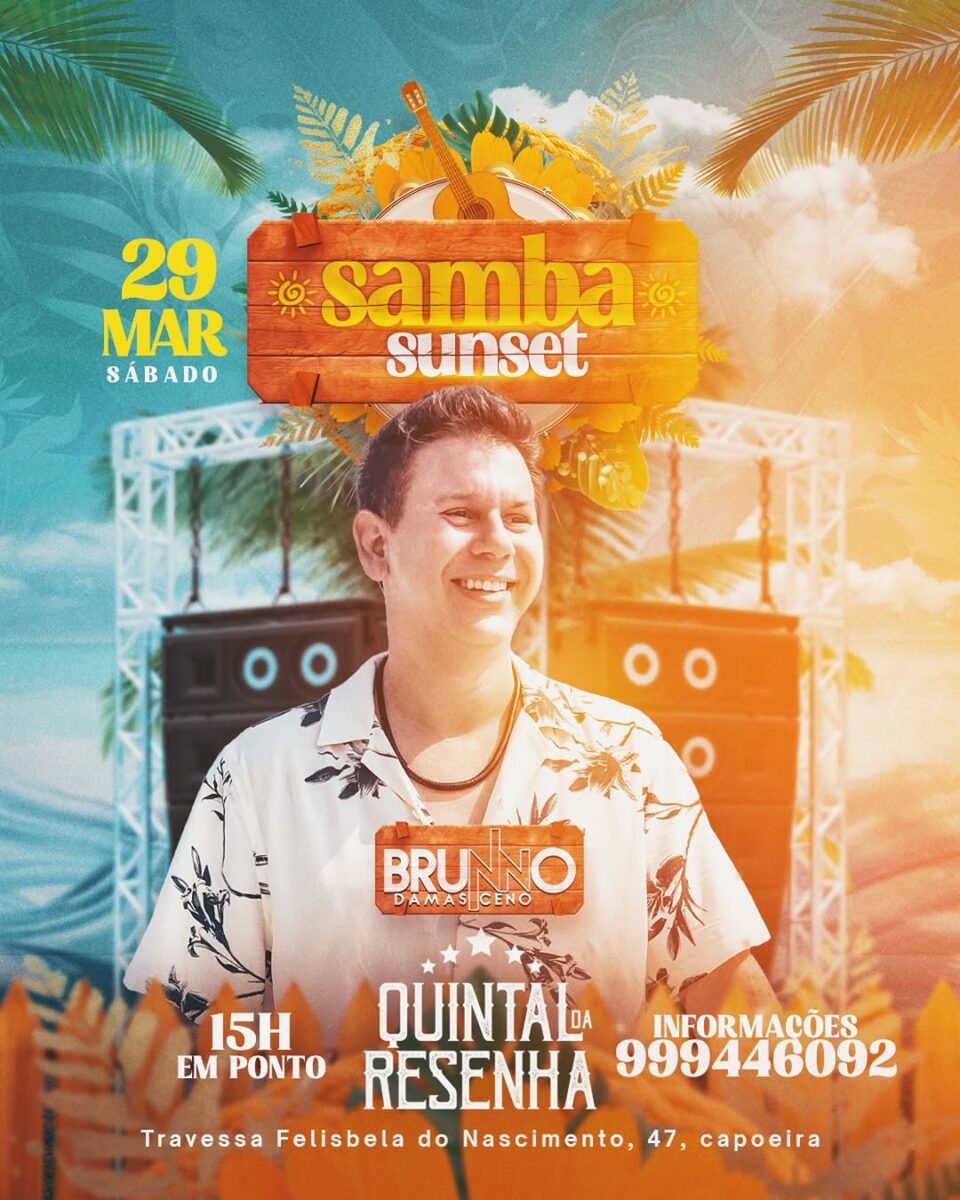 O Quintal da Resenha vai estar aberto com o melhor samba da semana com Sunset maravilhoso com o Bruno Damasceno na tarde (era meio óbvio, não?) de sábado!