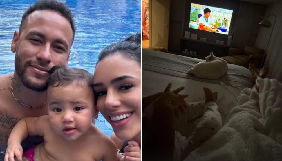 A influenciadora Bruna Biancardi, 30, usou as redes sociais, neste sábado (22), para publicar uma foto enquanto assistia TV ao lado de Neymar, 33, e da filha deles, Mavie, 1, após boatos de traição do jogador. Ela e o atleta esperam a segunda filha, que se chamará Mel.