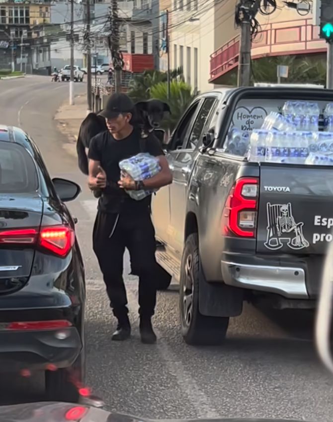 Durante a gravação, o homem chegou a acenar para a câmera, demonstrando bom humor diante da situação. Em determinado momento, ele recebeu uma caixa com garrafas de água, o que reforçou ainda mais a cena inusitada.