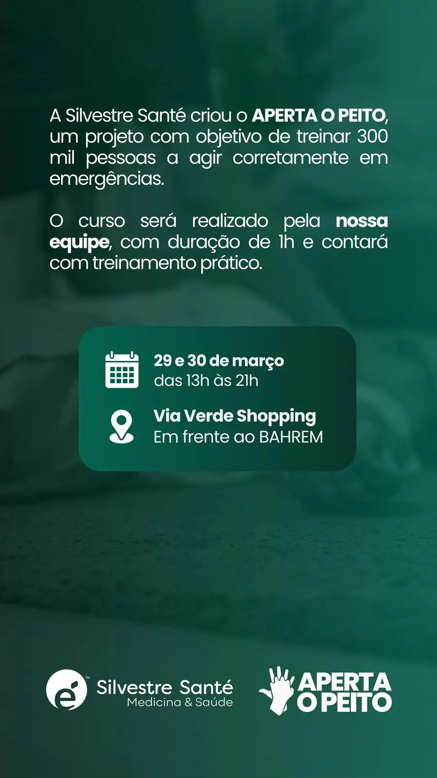 O Via Verde Shopping receberá nos dias 29 e 30 de março a campanha “Aperta o Peito”, uma iniciativa do Hospital Silvestre Santé que visa capacitar 300 mil pessoas no Acre com técnicas essenciais de Reanimação Cardiopulmonar (RCP). Com foco no cliente, o shopping se mantém dedicado a proporcionar conforto, segurança e experiências que impactam positivamente a vida das pessoas.