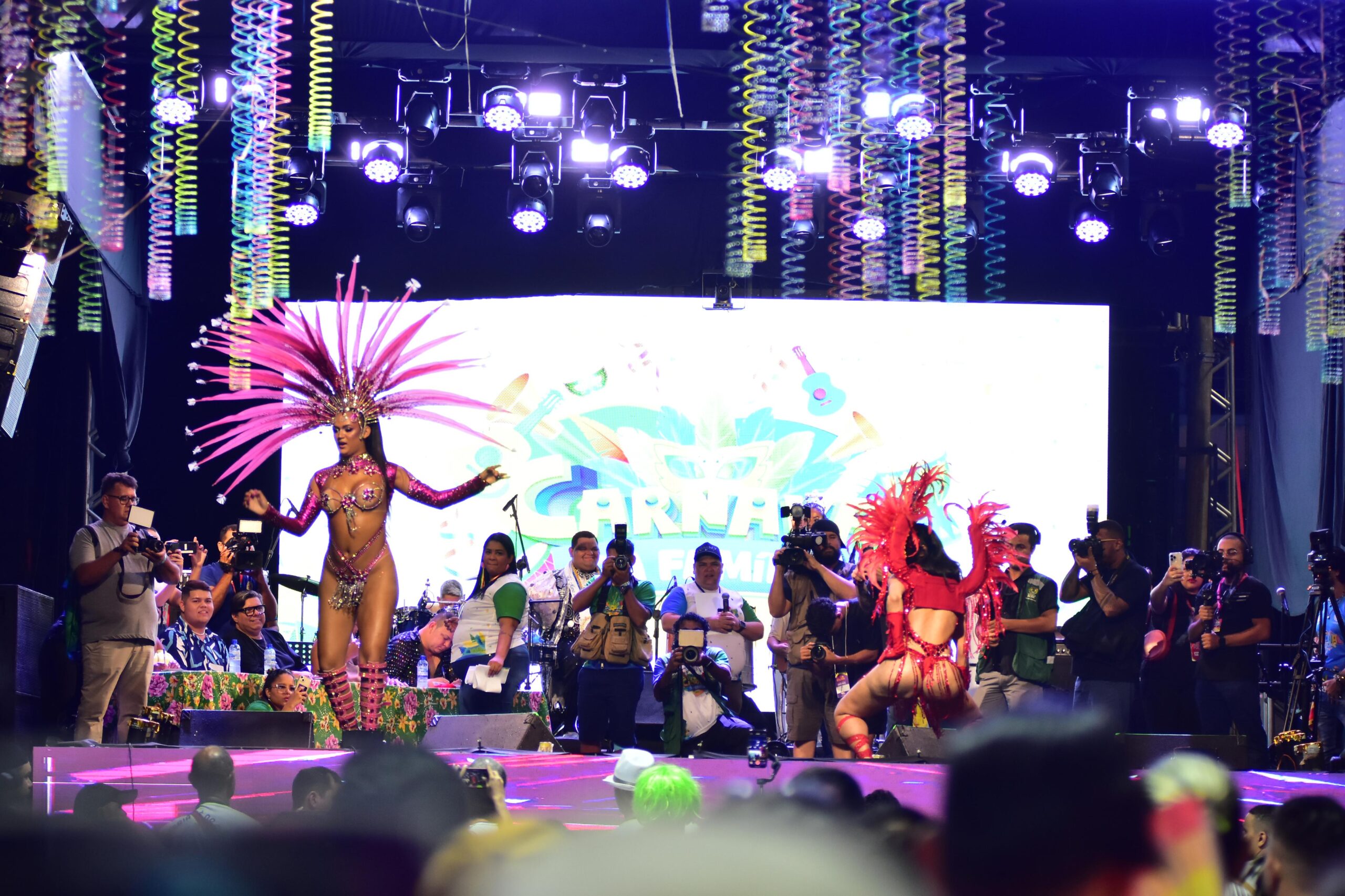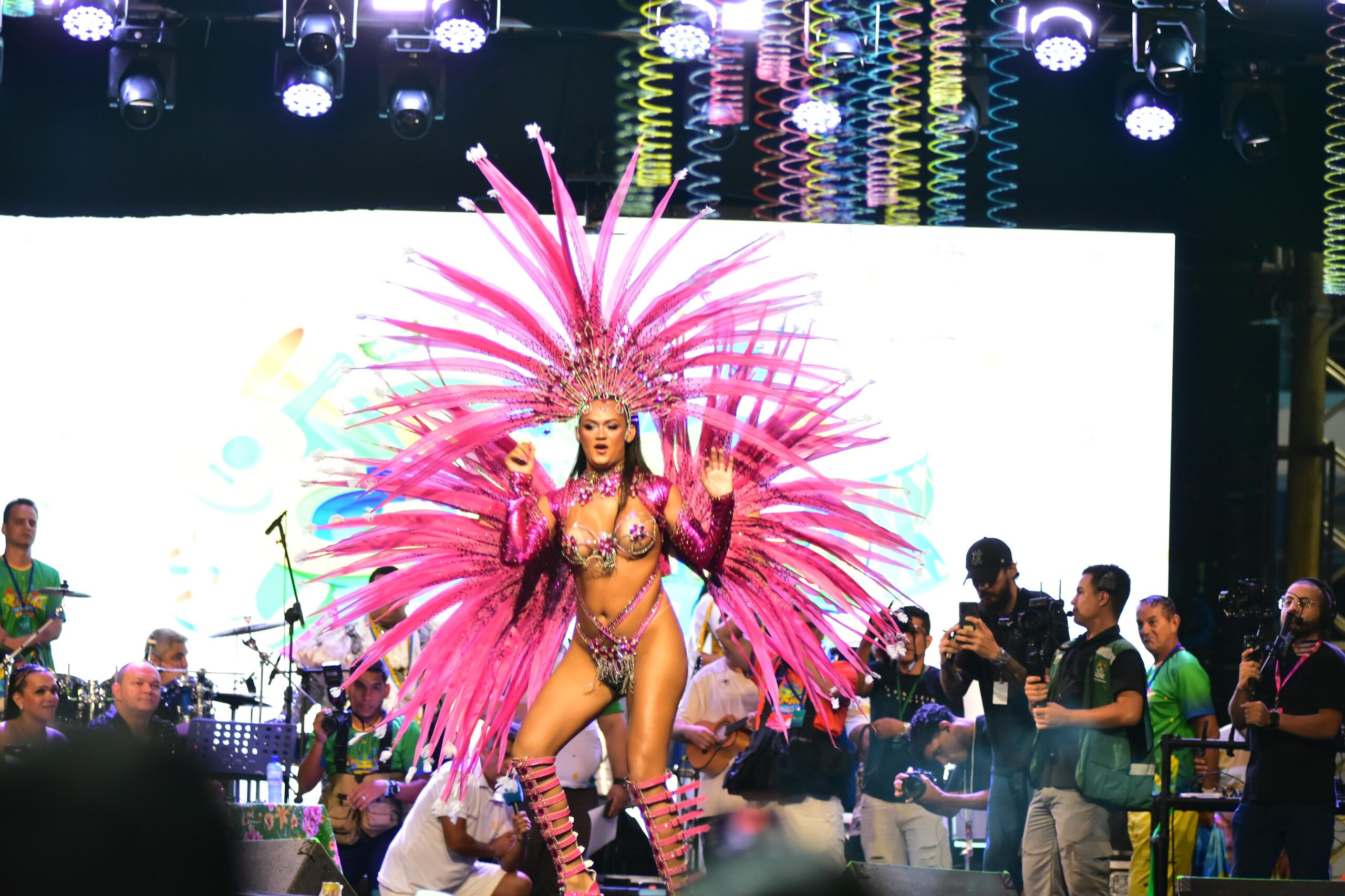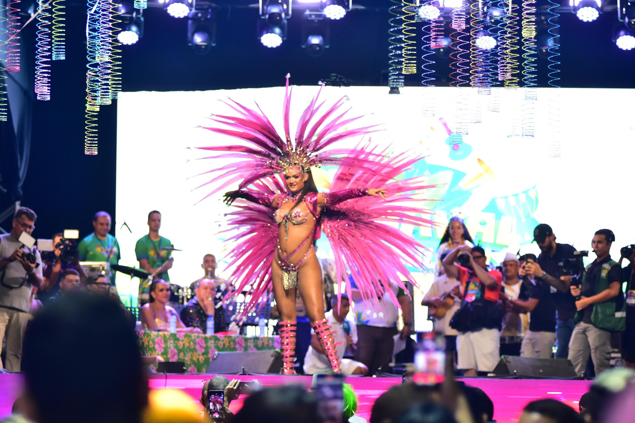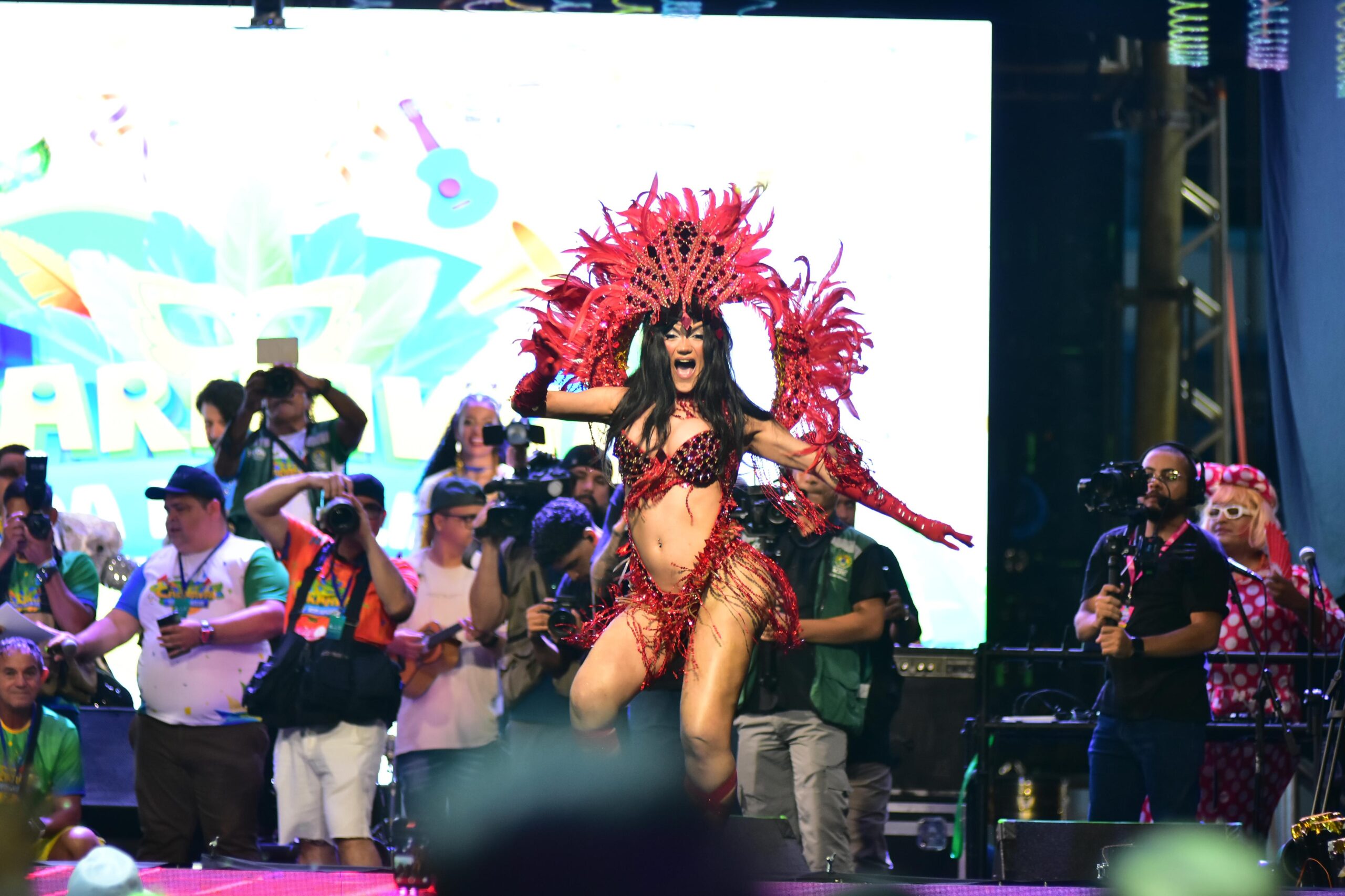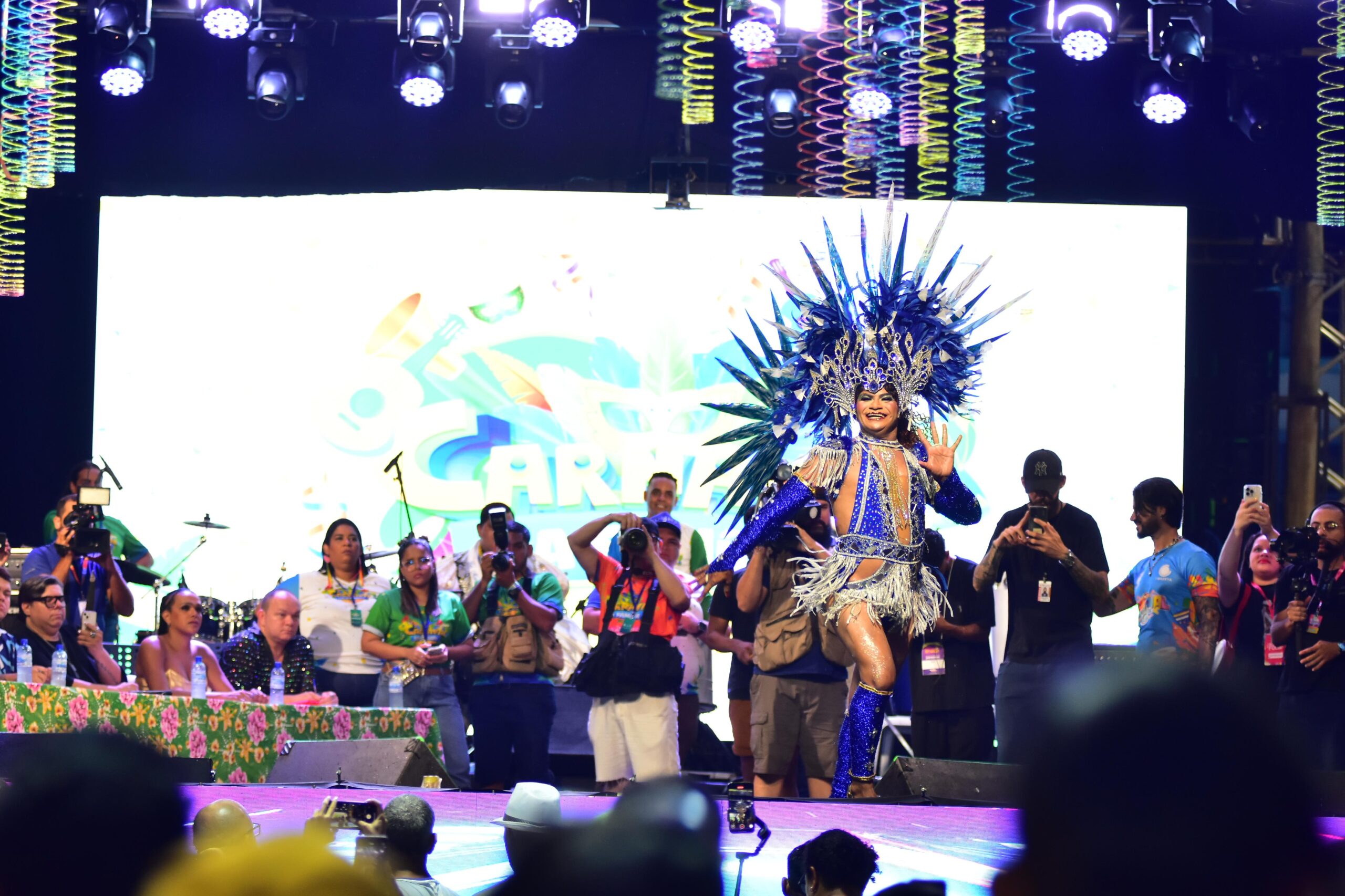Antes das candidatas, a Rainha do Carnaval 2025, Erica Oliveira, coroada na última sexta-feira (28), também se apresentou, assim como Junior de Mônaco, coroado Rei Momo.