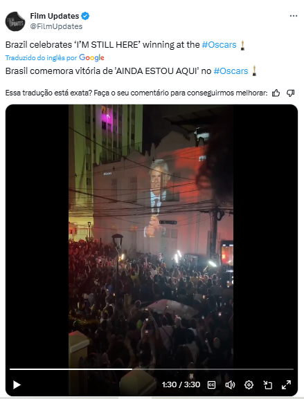 A legenda do vídeo, que já acumula milhões de visualizações, destaca a celebração brasileira: “Brasil comemora vitória de ‘Ainda Estou Aqui’ no #Oscar”. Nos comentários, internautas do mundo inteiro se impressionam com a reação calorosa do público. “Isso parece uma final de Copa do Mundo!”, escreveu um usuário.