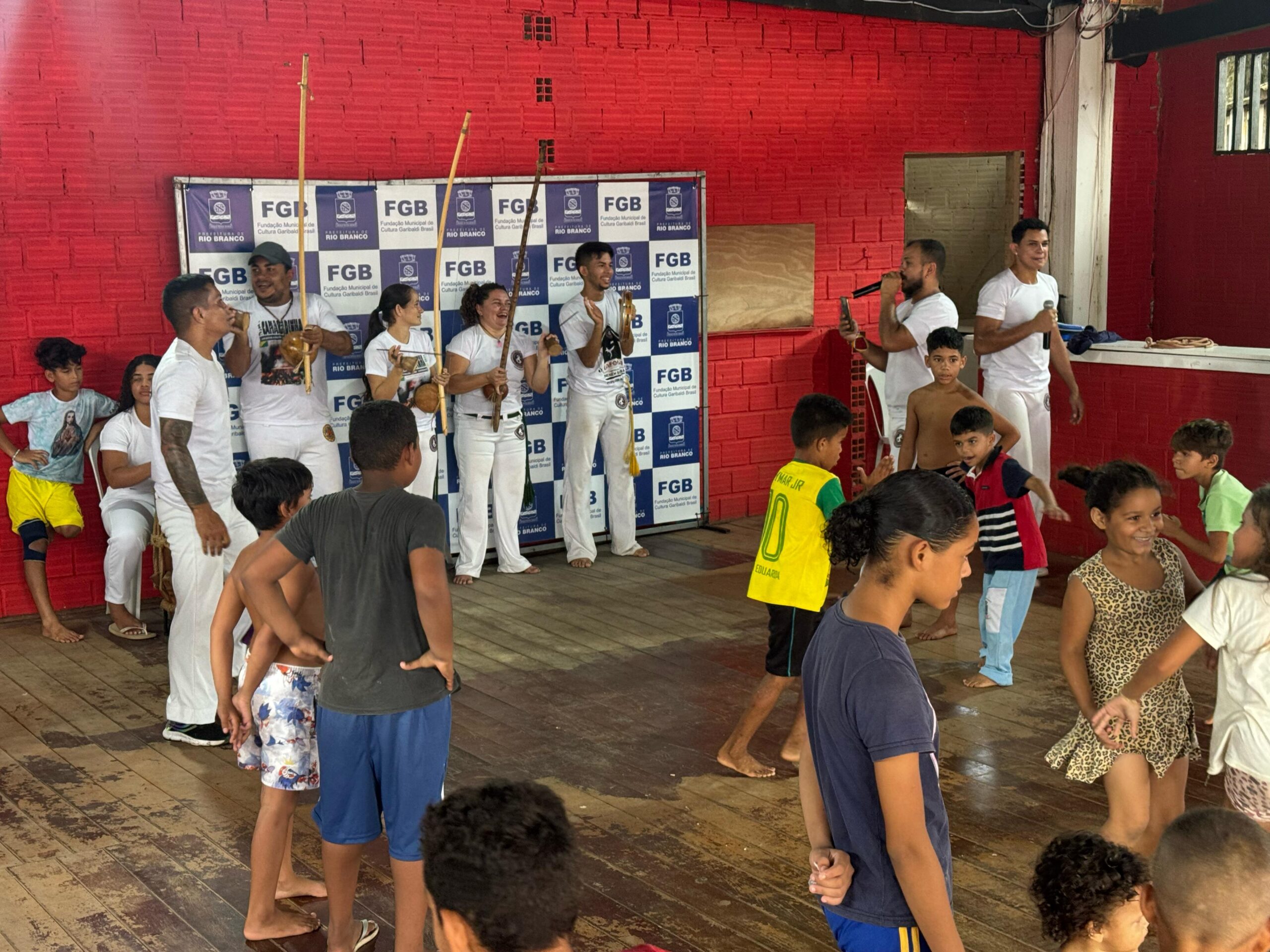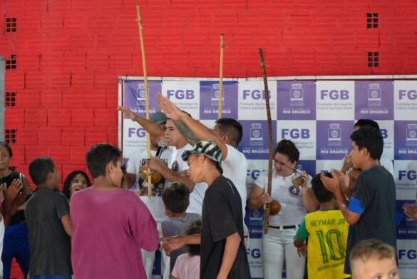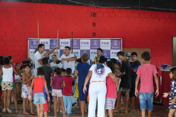 Na manhã deste sábado (22), o grupo Celeiro de Bamba reuniu dezenas de crianças para uma roda de capoeira no espaço da Fundação de Cultura Garibaldi Brasil, montado dentro do Parque de Exposições.
