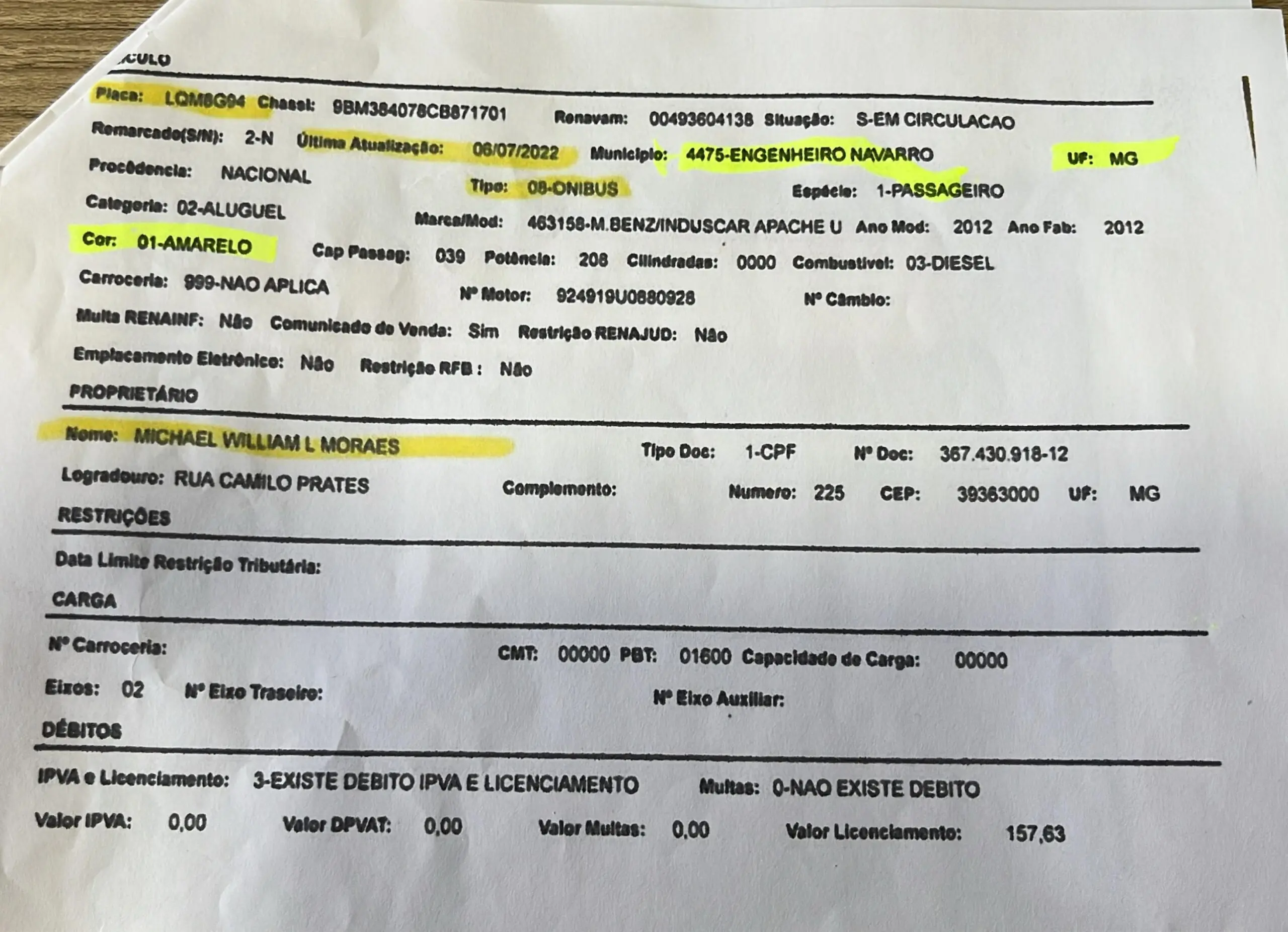 A última atualização do documento data de 06 de julho de 2022, ainda com placa pertencente ao município de Engenheiro Navarro (MG), com descrição de cor amarela. Outro ponto observado no documento do ônibus é a existência de débitos, tanto de IPVA, quanto de Licenciamento.