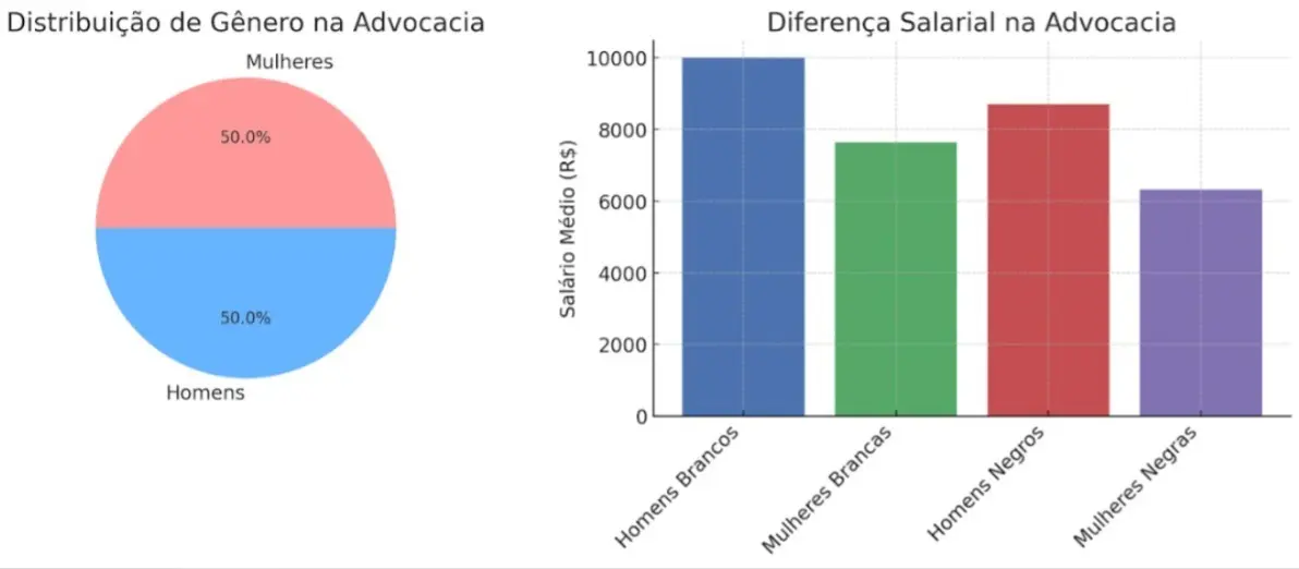 Embora as mulheres constituam metade da advocacia brasileira, ainda enfrentam disparidades salariais significativas. Dados do IBGE indicam que, em média, as advogadas recebem 23,6% menos do que seus colegas homens. Essa diferença é ainda mais acentuada entre mulheres negras, que ganham, em média, 36,7% menos do que homens brancos na mesma profissão.