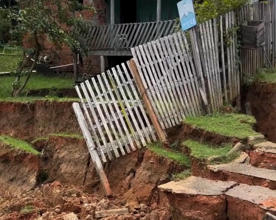 Nas imagens é possível observar que o desbarrancamento atingiu parte do terreno de um imóvel, e também, a lateral da residência.