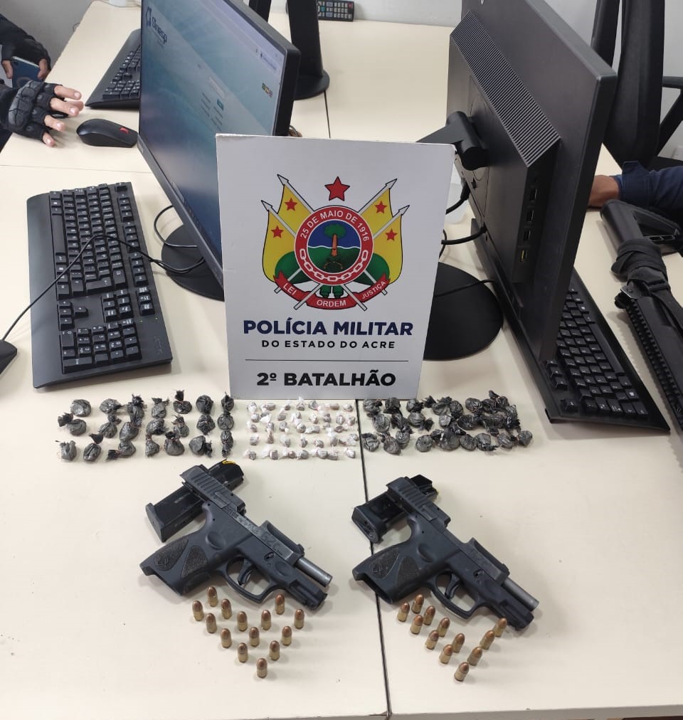 Na tarde do sábado (15), a Polícia Militar do Acre (PMAC) prendeu dois homens no bairro Amapá, após uma operação no loteamento Praia do Amapá, próximo ao ramal Holiday. Durante a abordagem, os suspeitos foram encontrados com duas pistolas 9mm e uma quantidade significativa de substâncias entorpecentes.