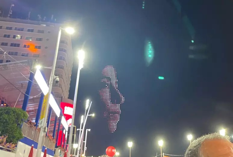 Na noite deste domingo (2), drones se juntaram para fazer o rosto da atriz no céu do circuito Barra-Ondina, o principal da capital baiana.