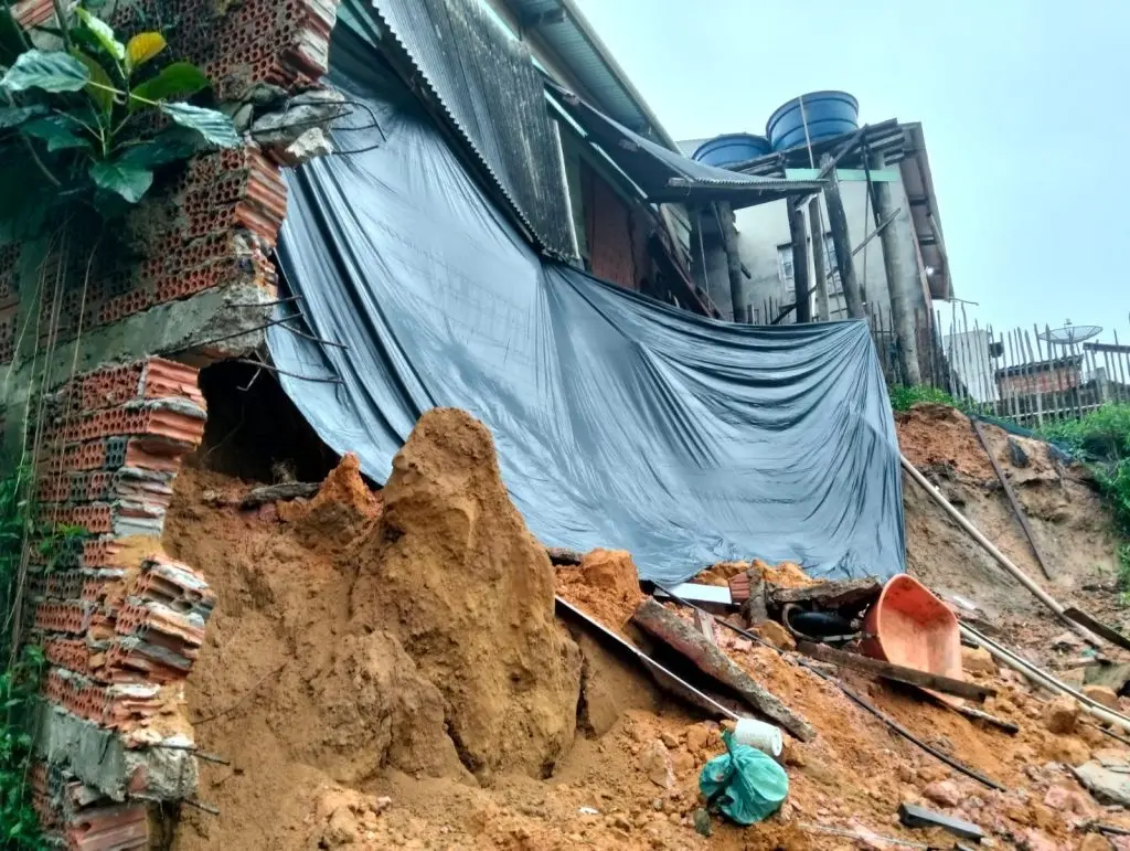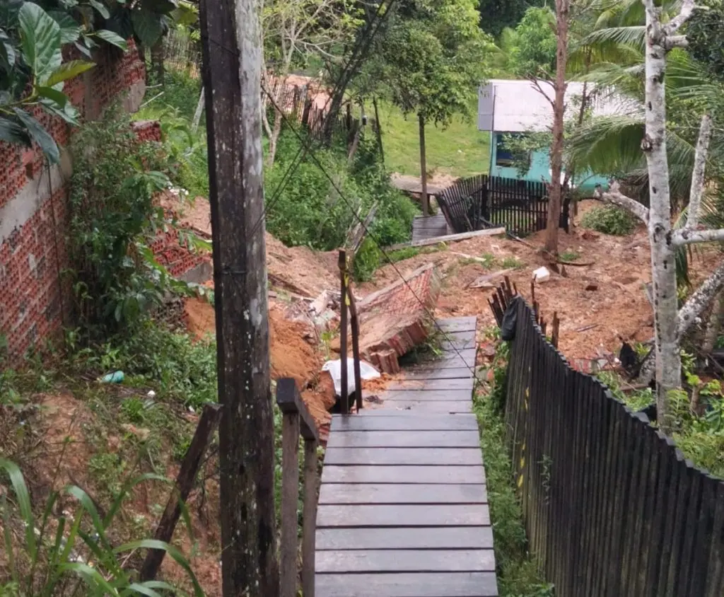 “Por volta de 1h15, a barreira no meu quintal desmoronou pela primeira vez, já prejudicando a ponte ao lado, usada pelos moradores da Rua Iaco. Depois, às 1h40, outro deslizamento ainda mais grave ocorreu, colocando minha casa em risco. O muro dos fundos foi destruído, e a lama atingiu a residência de uma vizinha lá embaixo”, contou Magna.