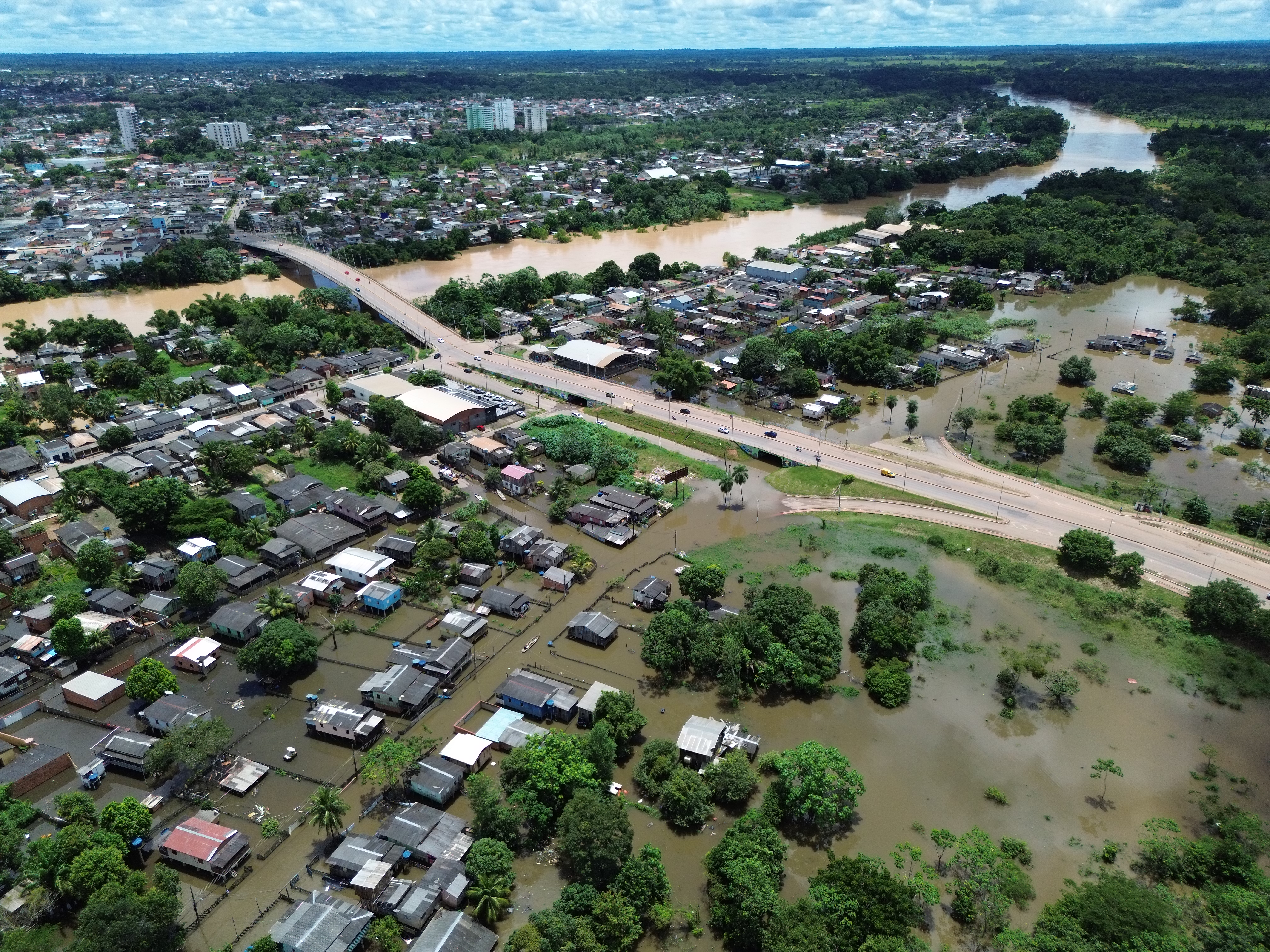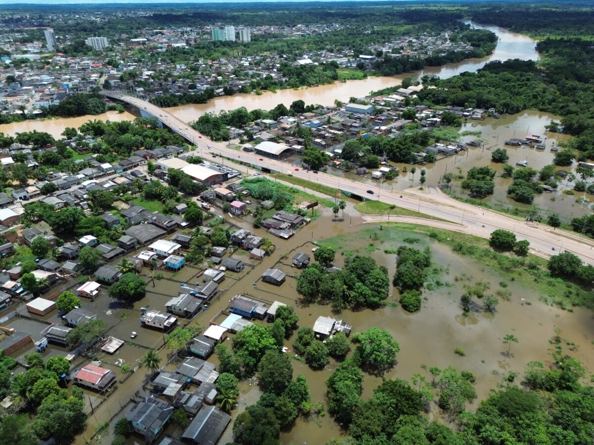 Na cobertura da enchente que já atinge 41 bairros de Rio Branco, o ContilNet produziu imagens aéreas do centro de Rio Branco, neste sábado (15).