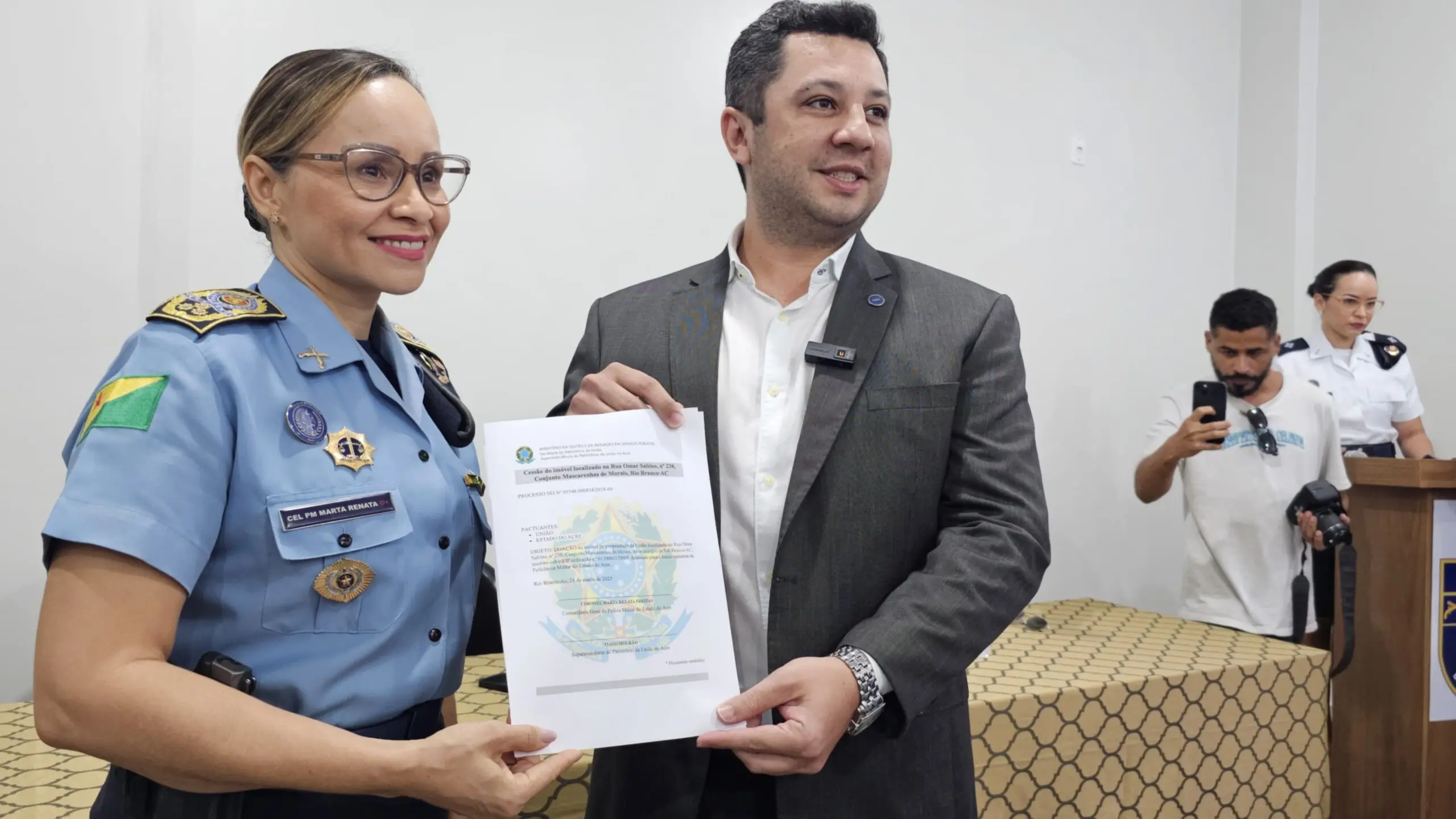 Comandante da PMAC, Marta Renata, e o secretário do Patrimônio da União, Tiago Mourão/Foto: ContilNet