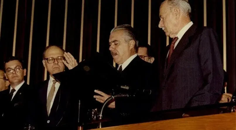 José Sarney, hoje com 95 anos, tomando posse como presidente da República depois de 21 anos de ditadura militar/Foto: Reprodução