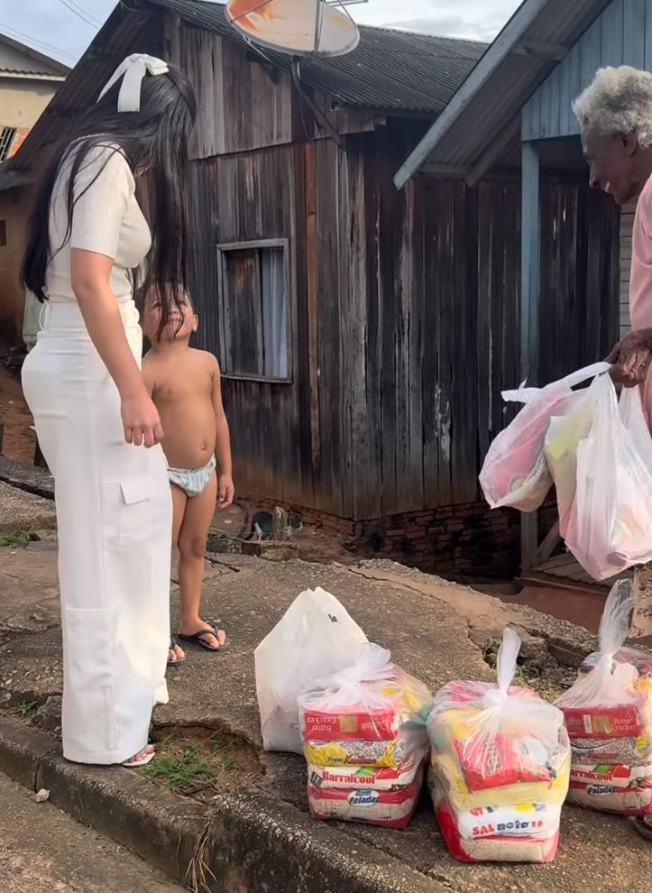 Em um vídeo publicado nas redes sociais, ela aparece entregando cestas básicas, carne e presentes para crianças a uma família em situação de vulnerabilidade