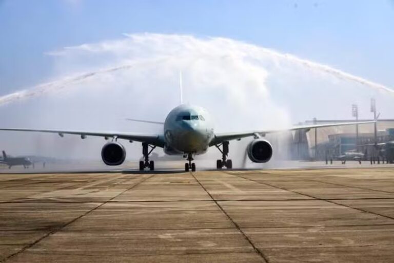 A aeronave KC-30, da FAB, cedida para a Operação “Raízes do Cedro” decolou da Base Aérea do Galeão — Foto: FAB