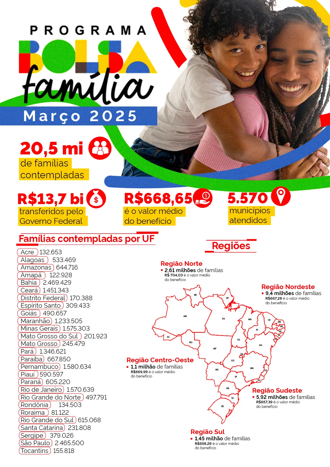 O Bolsa Família é um programa de transferência de renda do Governo Federal que oferece apoio financeiro a famílias em situação de vulnerabilidade em todo o Brasil. No Acre, o programa tem sido fundamental para amparar milhares de famílias, em março de 2025, o estado beneficia 132.653 famílias, com um investimento federal superior a R$ 94 milhões, garantindo um valor médio de R$ 716,08 para as famílias contempladas nos 22 municípios. O cronograma de pagamentos começa nesta terça-feira, 18 de março, e se estende até o dia 31, conforme o final do Número de Identificação Social (NIS).