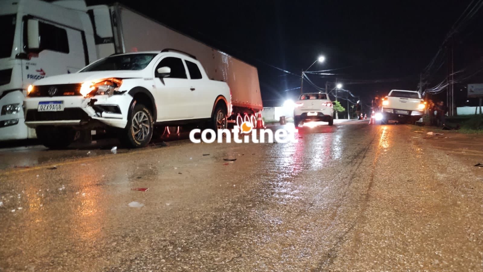 Ainda de acordo com o relato policial, a motocicleta e a Saveiro trafegavam no mesmo sentido, do centro da cidade em direção à rodovia, quando a caminhonete atingiu a traseira da moto, que havia parado no meio da pista para acessar uma rua à esquerda. No momento do impacto, a Hilux, que vinha no sentido oposto, não conseguiu desviar e também se envolveu na colisão.