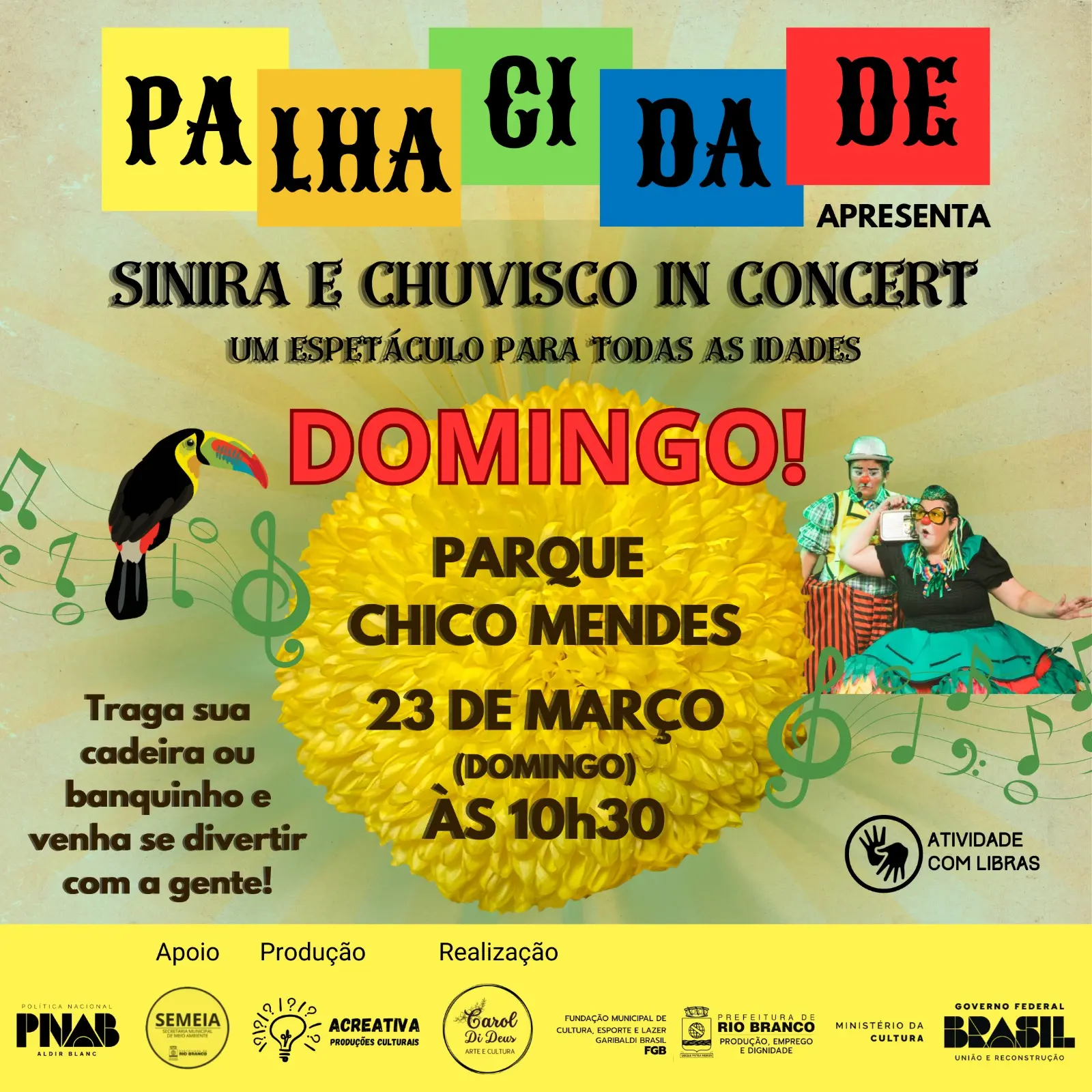 O público de Rio Branco tem um último encontro marcado com a magia do espetáculo Sinira e Chuvisco in Concert! neste domingo (23), às 10h30, no Parque Chico Mendes. A apresentação encerra a temporada do projeto Palhacidade, que mistura música e teatro em uma experiência cênico-musical repleta de humor, emoção e brasilidade.