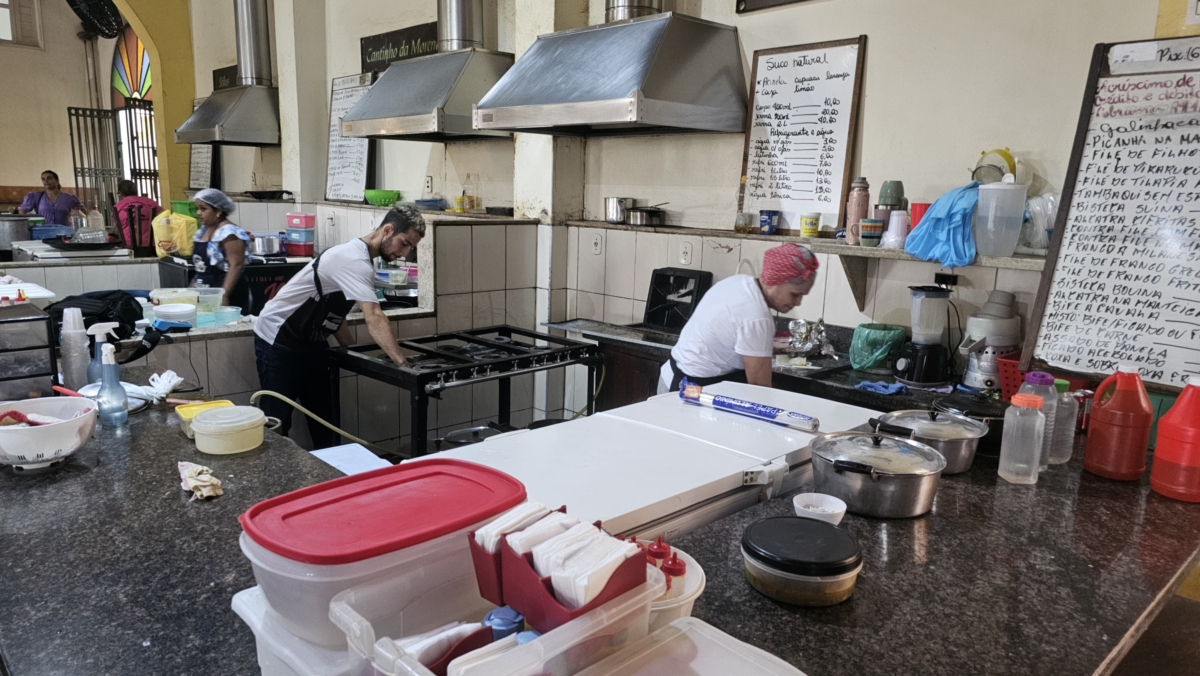“Ah, eu acordo às 5:30 e saio de casa antes das 6:30 porque é a hora que o supermercado abre. Eu chego aqui às 7:00, 7:30 e aí eu começo a fazer minhas coisas. Eu mesmo que tempero minhas carne, que faço minha comida toda e na hora de servir, meu genro que leva os pratos. Estamos aqui todo dia, até essa hora mais ou menos, umas 15:00”, conta a Mãezinha.