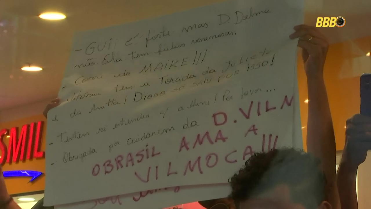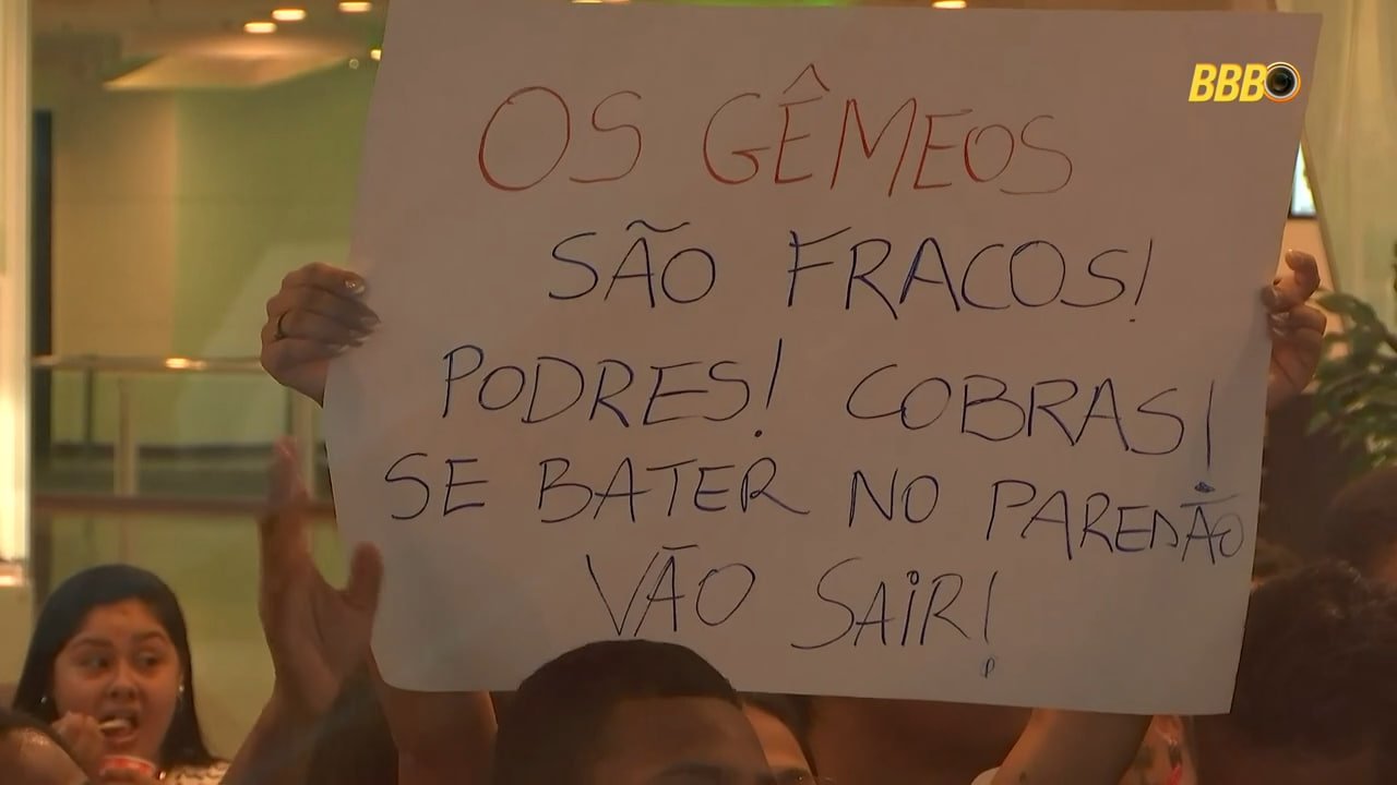 Cartaz: “Gui, Diego e Vitória precisam ir para o paredão juntos, eles estão fortes.”