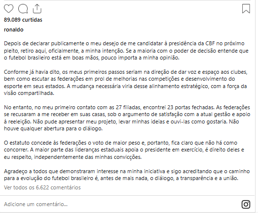 Em sua publicação, Ronaldo detalhou o que chamou de portas fechadas em seu primeiro contato com as 27 federações filiadas à CBF. De acordo com ele, 23 dessas entidades se recusaram a recebê-lo, alegando satisfação com a gestão atual e apoio à reeleição do presidente Ednaldo Rodrigues. “Não pude apresentar meu projeto, levar minhas ideias e ouvir as sugestões como gostaria. Não houve qualquer abertura para o diálogo”, escreveu.